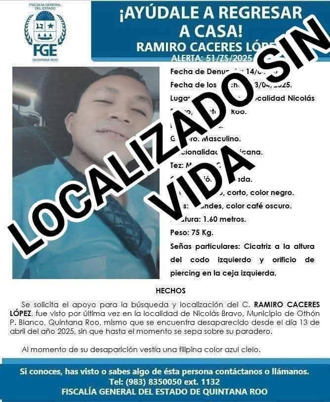 La FGE de Quintana Roo agradece la participación de la ciudadanía que se sumó a los operativos de búsqueda para dar con el paradero de esta persona.