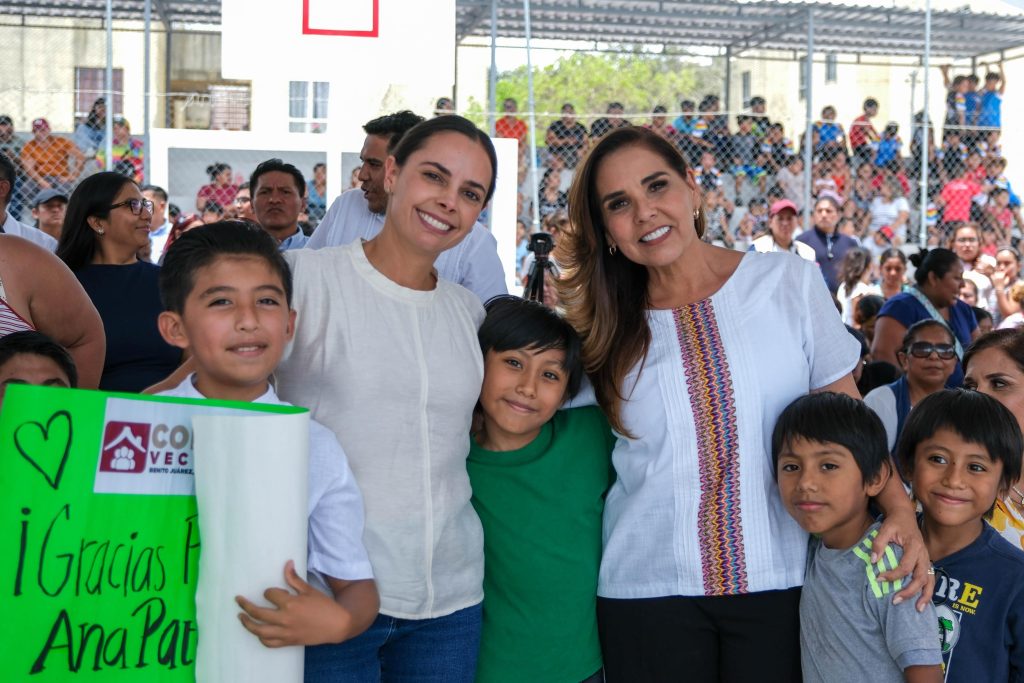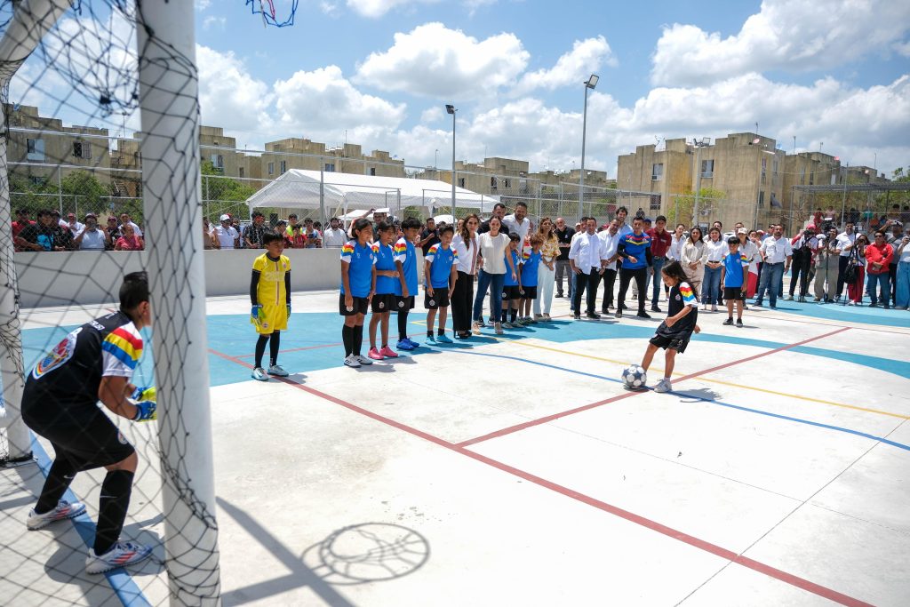A su arribo y antes de cortar el listón inaugural, Mara Lezama saludó a niñas y niños, platicó con ellos y observó cómo se divertían en los juegos infantiles. La gobernadora dio la patada inaugural en las canchas de usos múltiples.