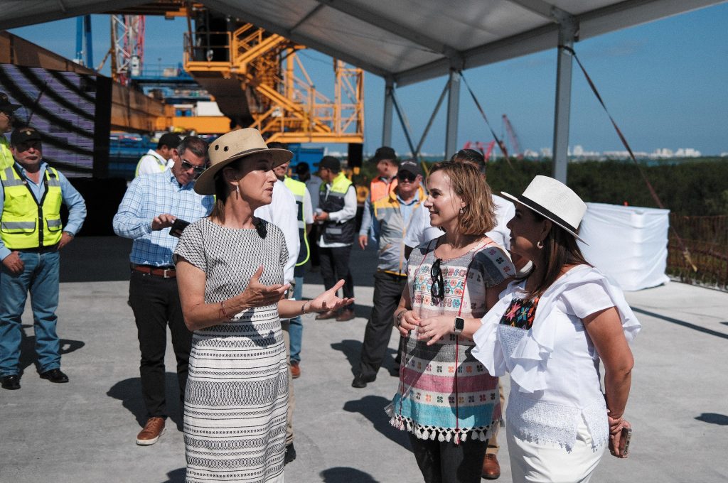 Cancún, 26 de abril del 2025.- Acompañada de la gobernadora Mara Lezama Espinosa y de Guadalupe Phillips, de la empresa ICA, la Presidenta Claudia Sheinbaum supervisó los avances que presenta actualmente la construcción del puente vehicular Nichupté, como parte de una gira de trabajo que inició en Cancún.