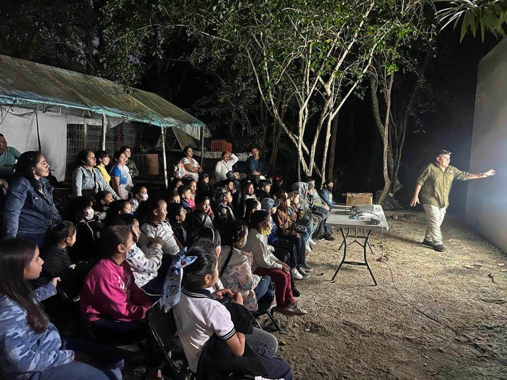 Como parte de estas acciones, se impartió una plática de educación ambiental dirigida a niñas y niños de la comunidad, quienes tuvieron la oportunidad de observar murciélagos antes de ser liberados.