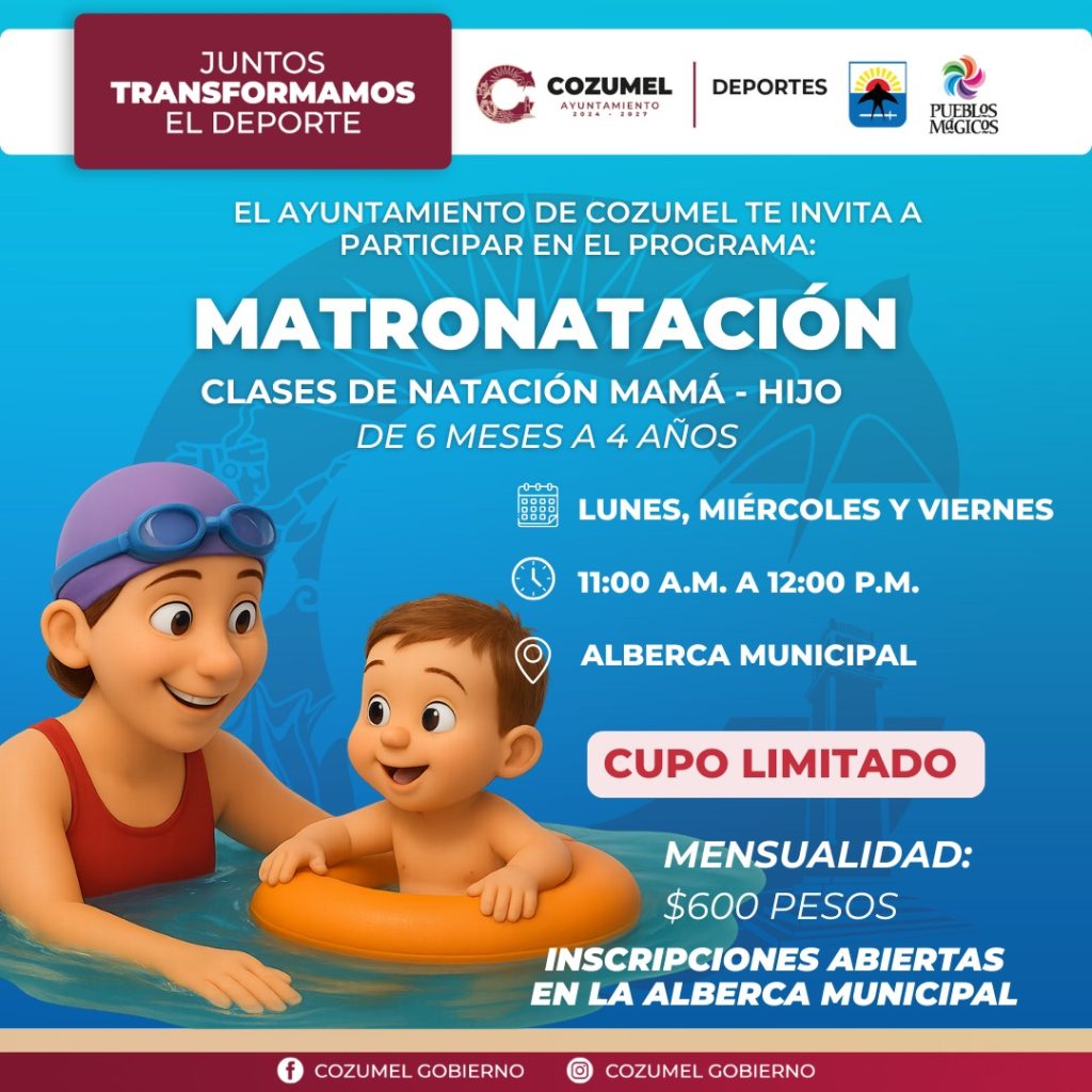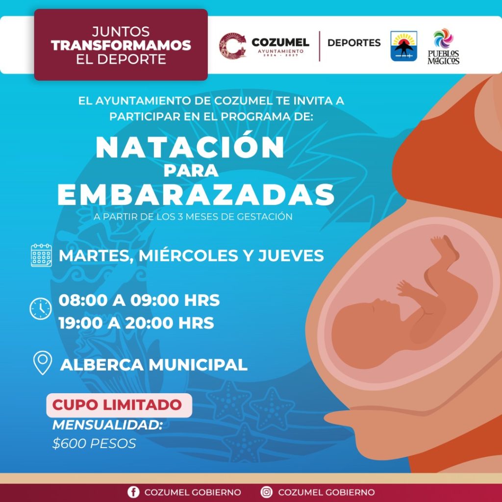 Las clases de natación para embarazadas se llevan a cabo en la alberca municipal los martes, miércoles y jueves en dos horarios: de 08:00 a 09:00 horas y de 19:00 a 20:00 horas, a partir del tercer mes de gestación. Por su parte, el programa de “Matronatación”, está dirigido a mamás con niños de 6 meses a 4 años, y se imparte los lunes, miércoles y viernes de 11:00 a 12:00 horas. Ambos programas tienen una cuota mensual de 600 pesos y cupo limitado.