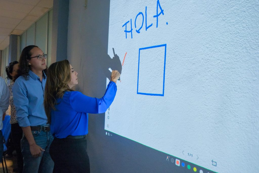 Al concluir el evento, alumnos de la carrera de Ingeniería en Sistemas le explicaron a la gobernadora Mara Lezama los beneficios del nuevo equipo que recibió el Tecnológico de Cancún a través del IFEQROO. 55 proyectores interactivos en total para todas las aulas, que beneficiarán a los alumnos en clases a distancia.