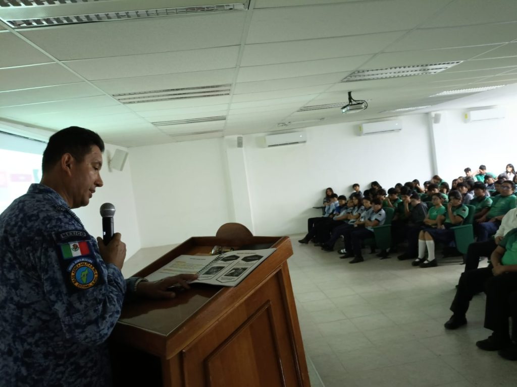 La ponencia fue impartida por el Diplomado de Estado Mayor, Fuerza Aérea Piloto Aviador, Jesús Andrés Meneses Canchola, representante de la B.A.M. subrayó la importancia de mantener la atención ante cualquier situación que represente un riesgo físico o emocional para las y los jóvenes.