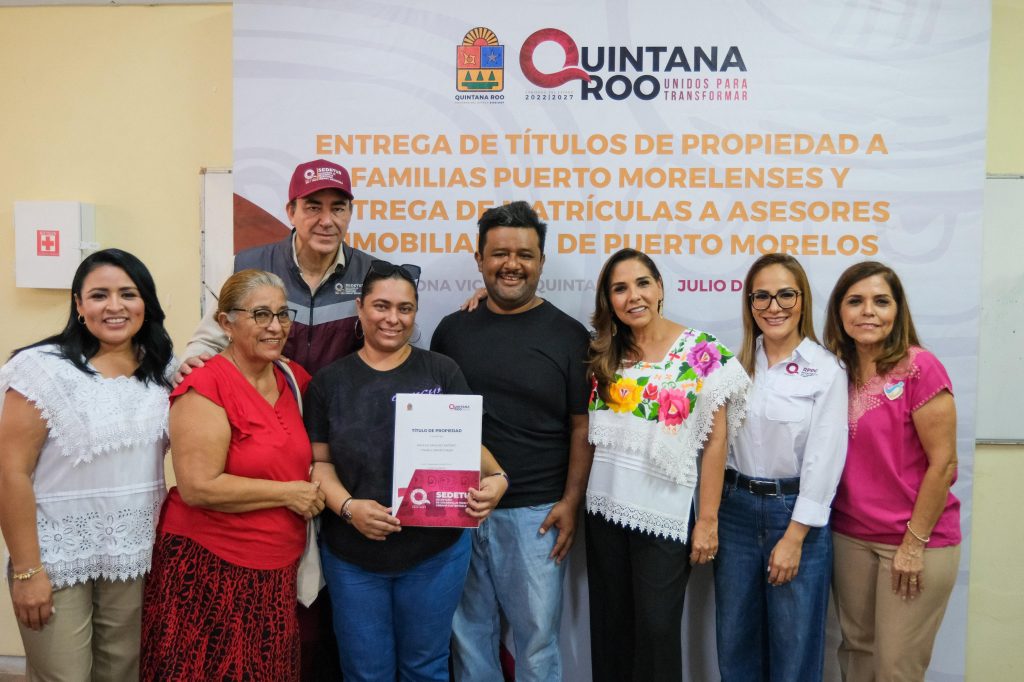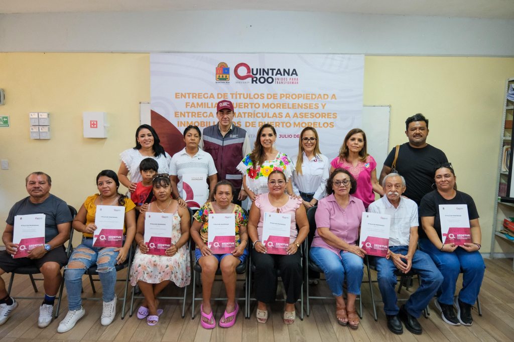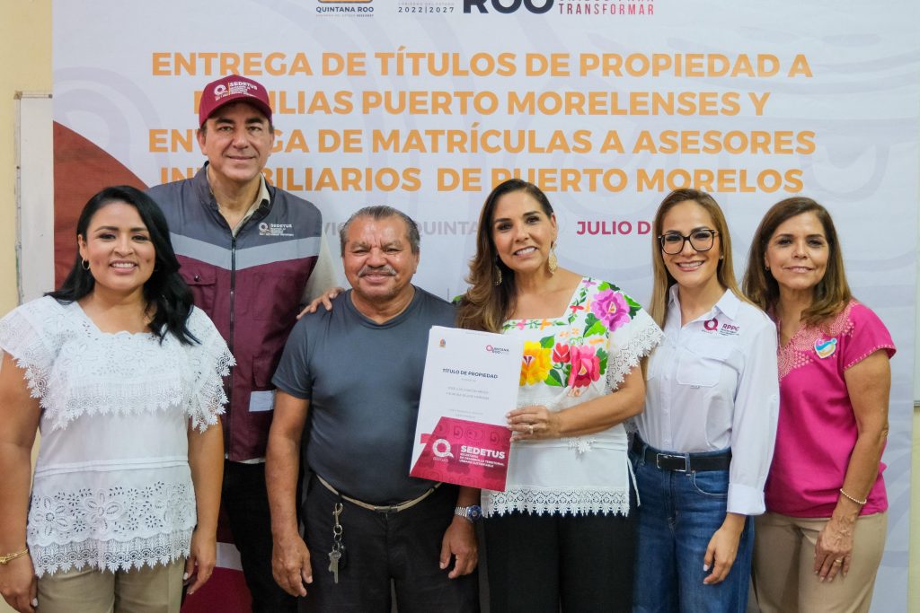 Junto con la presidenta municipal de Puerto Morelos, Blanca Merari Tziu; del secretario de Desarrollo Territorial Urbano Sustentable, José Alberto Alonso Ovando y de la directora general del Registro Público de la Propiedad y del Comercio, Mariann González Pliego, la Gobernadora entregó directamente y en propia mano los títulos.