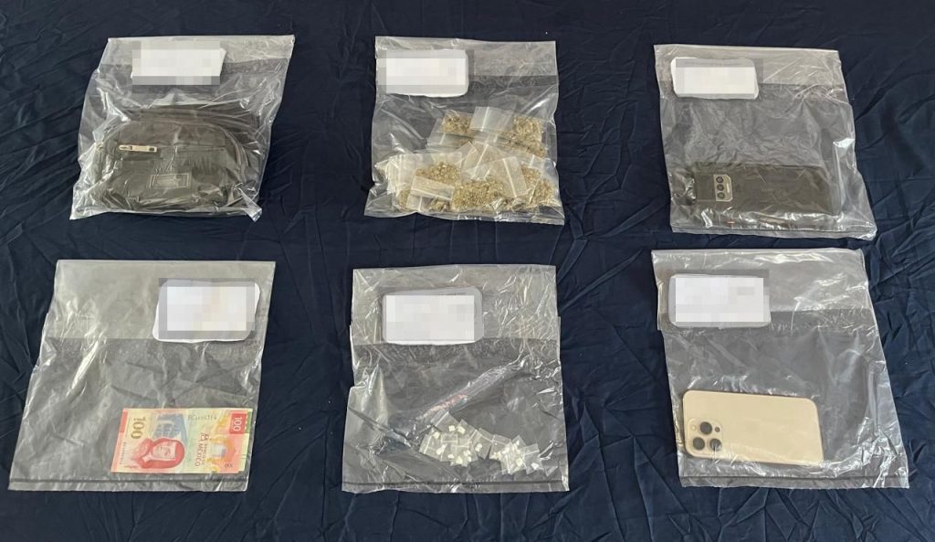 Como resultado, se aseguró una cangurera, 25 bolsitas de plástico transparente que contenían vegetal verde con características similares a la marihuana; 13 bolsitas de plástico transparente con fragmentos sólidos color blanco con características similares al crack; 300 pesos mexicanos en billetes de diferentes denominaciones; dos celulares y una motocicleta marca Italika, tipo FT150, color rojo con negro.