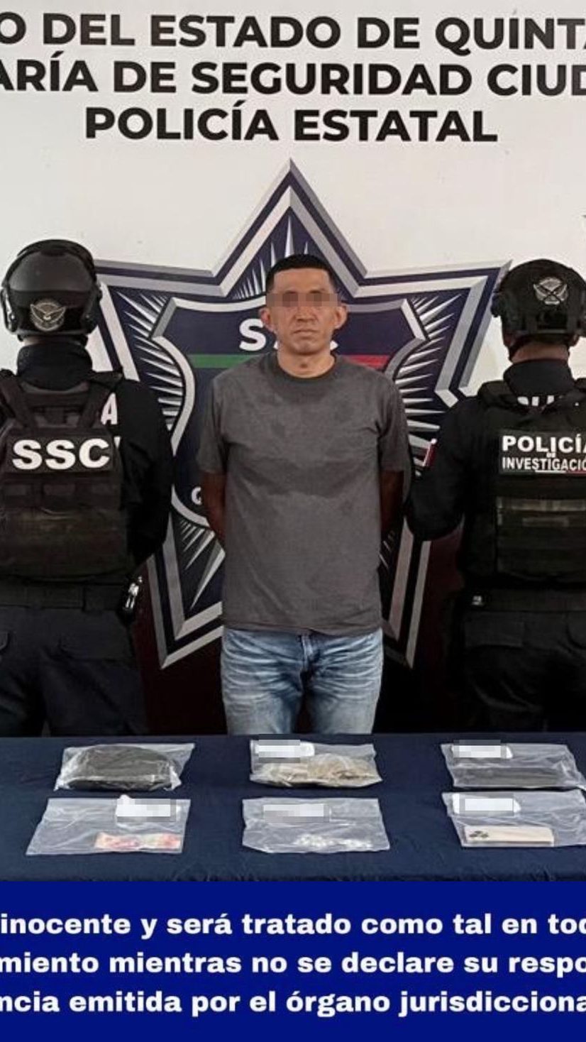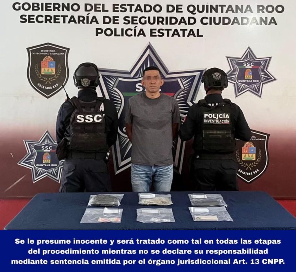 Cancún, 28 de julio del 2025.- Durante recorridos de vigilancia, elementos de la Secretaría de Seguridad Ciudadana observaron a dos masculinos que se encontraban junto a una motocicleta e intercambiaban bolsitas con vegetal verde con características similares a la marihuana.