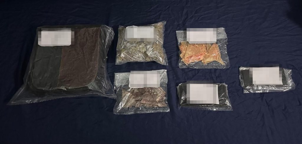 Como resultado, se aseguraron 65 bolsitas de plástico transparente con vegetal verde con características similares a la marihuana; 14 bolsitas triangulares traslúcidas color café con fragmentos sólidos blancos con características similares a la piedra; 18 bolsitas triangulares con fragmentos cristalinos con características similares al cristal; una mariconera; dos teléfonos celulares; y una motocicleta marca BMW, tipo F900XR, color negro, con placas de la Ciudad de México.