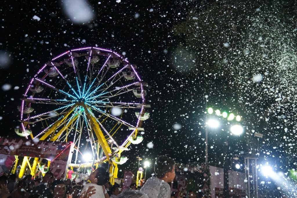 La Explanada de la Bandera quedó completamente iluminada para recibir a las familias que, del 1 al 19 de diciembre, podrán disfrutar de las villas navideñas, la pista ecológica de patinaje, espectáculos culturales, la puesta en escena de El Cascanueces, presentaciones musicales y stands con productos artesanales y locales, impulsados por emprendedoras y emprendedores quintanarroenses.