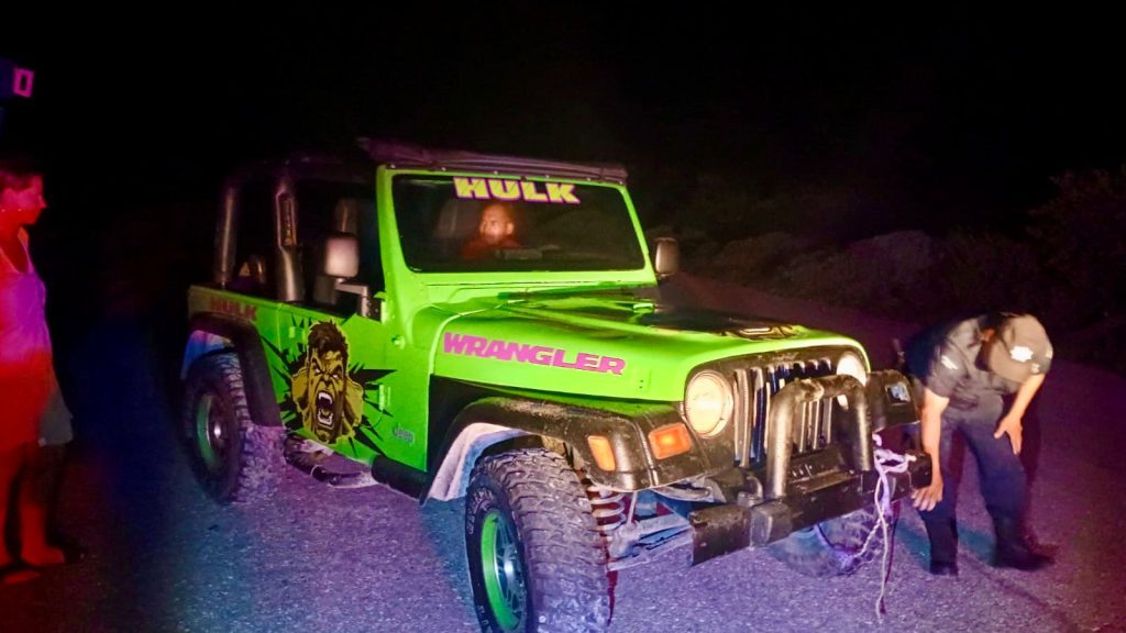 El reporte fue recibido alrededor de las 21:00 horas, alertando sobre un jeep atascado con dos personas a bordo.