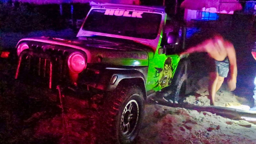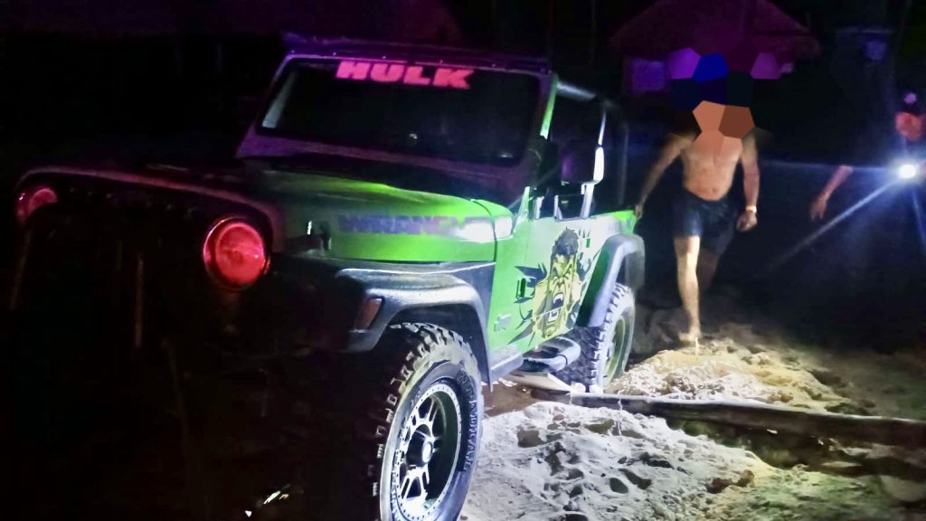 Cozumel, 11 de enero de 2026.-Elementos de Seguridad Pública, en coordinación con la Policía Turística, realizaron el rescate oportuno de una pareja de turistas extranjeros cuyo vehículo quedó varado en una duna de la zona costera oriental de la isla.