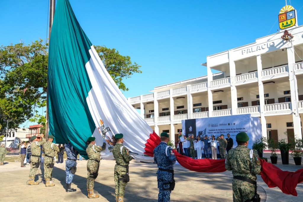 Chetumal, 6 de febrero de 2026.- Con el izamiento de la Bandera Nacional en la explanada de Palacio de Gobierno, en la capital del estado, la gobernadora Mara Lezama Espinosa encabezó el inicio oficial de los festejos de “Febrero, mes del Ejército y Fuerza Aérea Mexicanos”, una conmemoración que contempla actividades cívicas, culturales, deportivas y de proximidad social en la entidad.