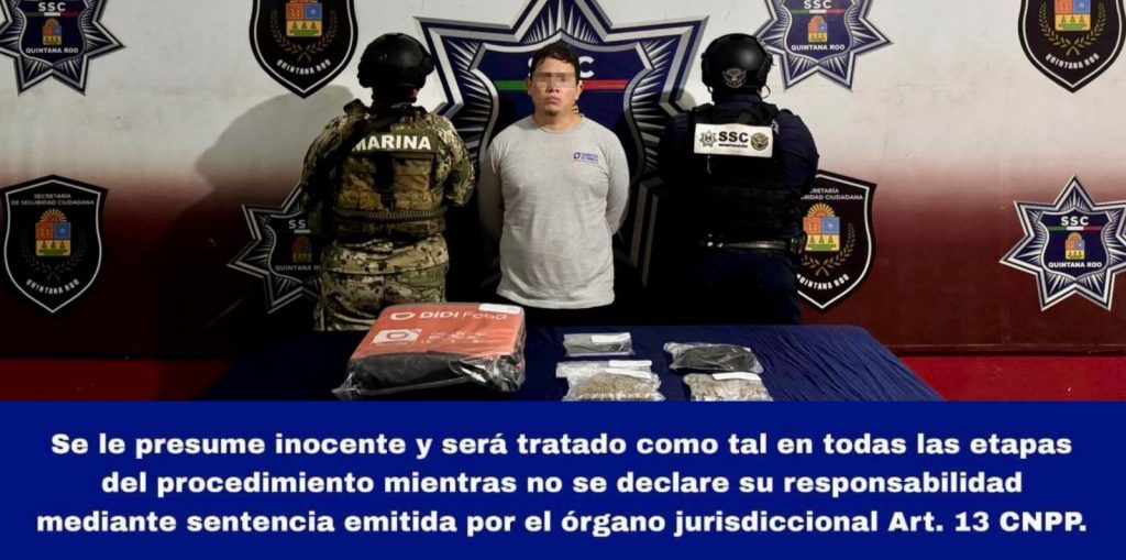 Cancún, 11 de febrero de 2026.- Elementos de la Secretaría de Seguridad Ciudadana, del Grupo de Investigación, en coordinación con la Secretaría de Marina, se percataron de un masculino quien manipulaba varias bolsitas de plástico transparente tipo ziploc, que en su interior contenían hierba verde y seca con las características similares a la marihuana.