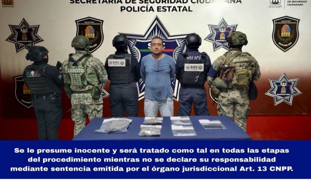 Cozumel, 21 de febrero de 2026.- Durante recorridos de vigilancia, elementos del Grupo de Investigación de la Secretaría de Seguridad Ciudadana, de la Secretaría de Marina y de la Defensa Nacional; visualizaron a un masculino manipulando y olfateando una bolsa mediana de plástico transparente con hierba seca y verde, con características similares a la droga comúnmente conocida como marihuana.