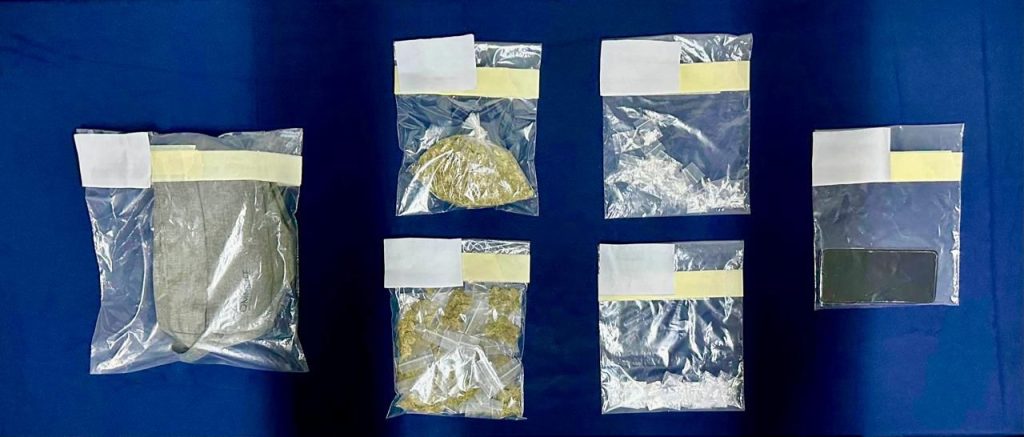 Se decomisó una bolsa mediana de plástico transparente y 30 bolsitas de plástico tipo ziploc, que contenían hierba seca y verde similar a la marihuana; 20 bolsitas de plástico transparente tipo ziploc, que contenían fragmentos sólidos transparentes similares al cristal; 24 bolsitas de plástico transparente tipo ziploc que contenían fragmentos sólidos color blanco, similares al crack; una mariconera color gris y un teléfono celular.