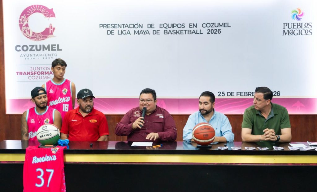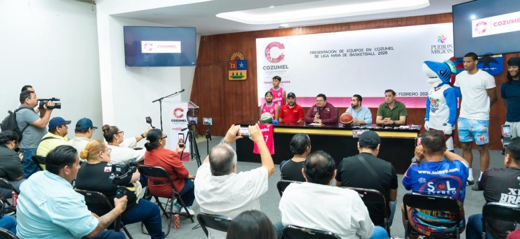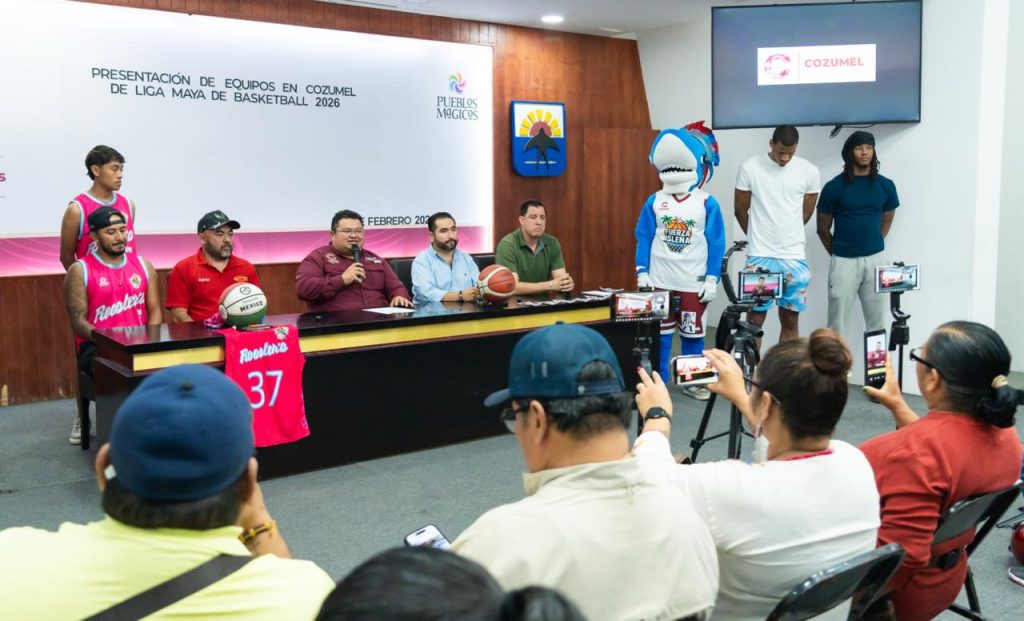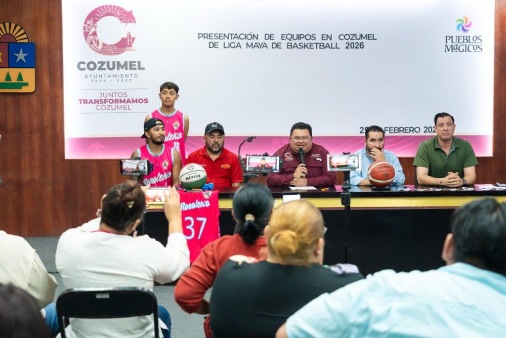 Cozumel, a 25 de febrero de 2026.- El presidente municipal, José Luis Chacón Méndez, presentó en rueda de prensa a los equipos locales Rooster’s de Cozumel y Fuerza Isleña, quienes el próximo 28 de febrero iniciarán su participación en la temporada 2026 de la Liga Maya de Básquetbol.