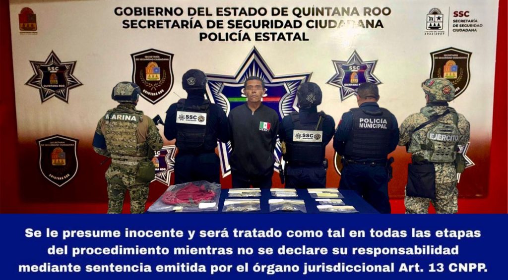 Cozumel, 03 de abril de 2026.- Elementos del Grupo de Investigación de la Secretaría de Seguridad Ciudadana, en coordinación con la Secretaría de Marina, de la Secretaría de la Defensa Nacional, y de la Policía Municipal de Cozumel, se percataron de un masculino quien estaba manipulando varias bolsitas de plástico transparente, que en su interior contenían vegetal verde y seco con las características similares a la marihuana.