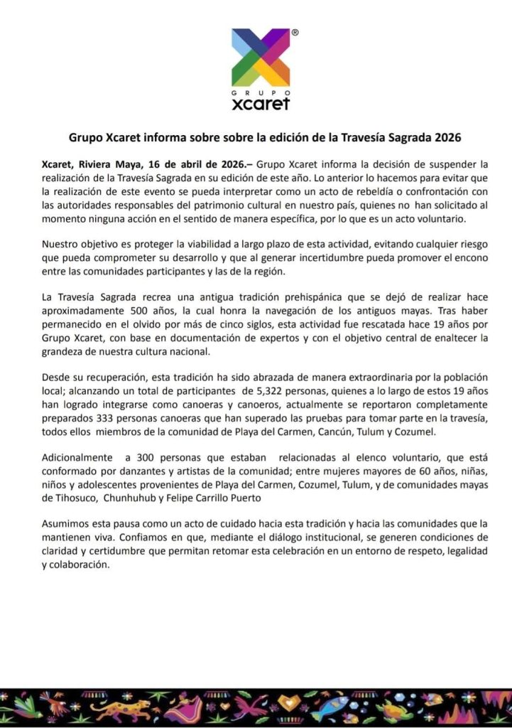 Xcaret, Riviera Maya, 16 de abril de 2026.– Grupo Xcaret informa la decisión de suspender la realización de la Travesía Sagrada en su edición de este año. Lo anterior lo hacemos para evitar que la realización de este evento se pueda interpretar como un acto de rebeldía o confrontación con las autoridades responsables del patrimonio cultural en nuestro país, quienes no han solicitado al momento ninguna acción en el sentido de manera específica, por lo que es un acto voluntario.