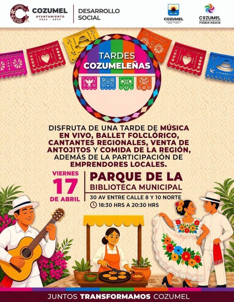 Cozumel, 17 de abril de 2026.- El gobierno municipal que encabeza José Luis Chacón Méndez, a través de la dirección de Desarrollo Social, invita a la ciudadanía a disfrutar del regreso de las “Tardes Cozumeleñas”, un espacio que promueve la convivencia familiar y, al mismo tiempo, impulsa el talento y el esfuerzo de las y los emprendedores cozumeleños, quienes ofrecerán una variedad de productos, antojitos y comida típica de la región, fortaleciendo así la economía local.