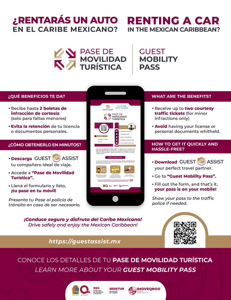 El secretario de Turismo, Bernardo Cueto Riestra, explicó que este “Pase de Movilidad Turística” se encuentra en la plataforma Guest Assist que debe descargarse en el móvil. Se llena el formulario con información personal, de la arrendadora y el coche rentado, y queda listo para usarse, en caso necesario. Este Pase proporciona 2 boletas de cortesía por infracciones menores y evita la retención de la licencia de conducir u otro documento.