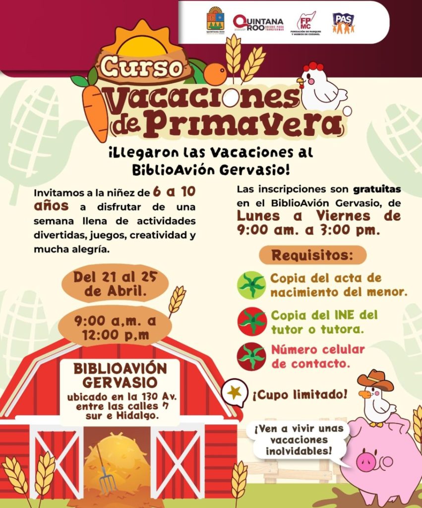 Cozumel, 13 de abril de 2025.– Para que las niñas y los niños disfruten unas vacaciones llenas de alegría, diversión, aprendizaje y convivencia, la Fundación de Parques y Museos de Cozumel (FPMC) invita a infantes de 6 a 10 años a participar en el curso gratuito “Vacaciones de Primavera”, que se llevará a cabo del 21 al 25 de abril, en un horario de 09:00 a 12:00 horas, en el BiblioAvión Gervasio. Las inscripciones inician este lunes 14 de abril.