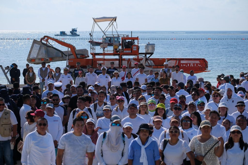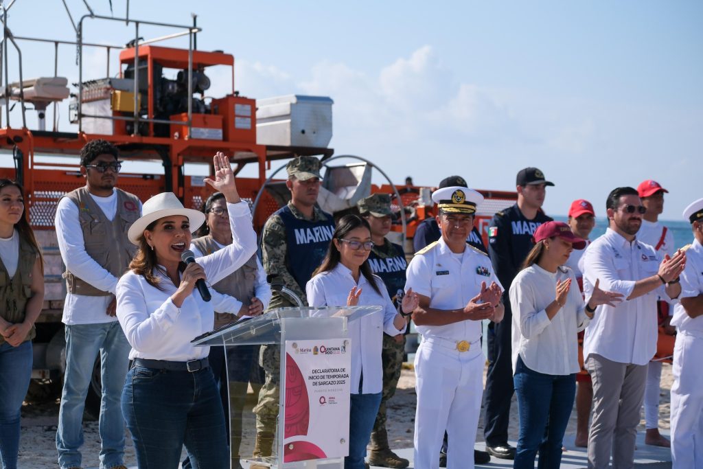 Puerto Morelos, 15 de abril del 2025. – Rodeada del personal, miembros de la sociedad civil, presidentas municipales, con el respaldo indiscutible de la Secretaría de Marina, la gobernadora Mara Lezama Espinosa declaró el inicio oficial de la temporada de sargazo 2025, que contempla una estrategia a gran escala para su monitoreo, contención, recolección y disposición final, con el resultado de mantener limpias las playas el mayor tiempo posible.
